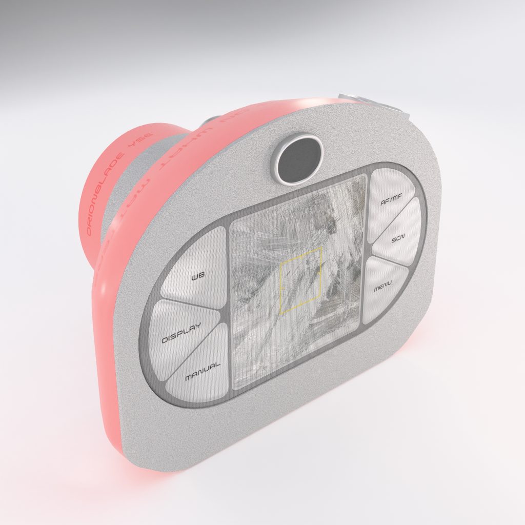 The OrionBlade is a DSLR camera that combines advanced technology with a bold, futuristic design. Its design is based on a unique combination of polygonal prism geometry with the delicate, flowing lines of a torus, creating an ergonomic and visually intriguing structure.